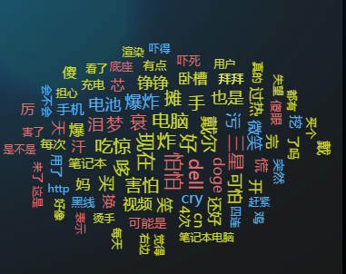 “戴尔电脑四连爆”舆情评论的词云图中,“电脑”、“炸”“怕怕”、“三星”、“害怕”等关键词分布在词云图的中心,且字体最大,是该舆情的情感主导词。