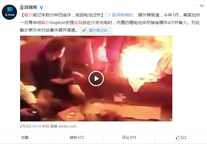 继三星、苹果爆炸之后,戴尔也传出一起笔记本爆炸事故。2017年2月9日消息,网络上一段关于戴尔笔记本连续4次爆炸的视频,将戴尔推到风口浪尖。一时间舆论哗然,有人笑称“难道是三星的高层跳槽到戴尔,带去了新的爆炸技术?”也有戴尔电脑使用者的恐慌:“看着桌子上插着电源的戴尔笔记本,我不禁开始瑟瑟发抖”。其中自然不缺潜在客户的吐槽:“我我我,我刚刚在联想与戴尔中选择了联想。”在网友的热议言论中,戴尔电脑爆炸的网络舆情逐渐向复杂态势演化,负面舆情亟待解决。