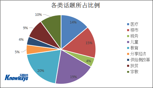在民生聚焦的比例图中,占比最大的话题是“教育”,比例达20%,数据量达6,469条;排在第二位的是“儿童”,占比19%,数据量为6,219条;排在第三的话题是“楼市”,占比15%,数据量达4,876条。除此之外,医疗、税务、分享经济、供给侧改革、扶贫、宗教等话题都在热点之内。