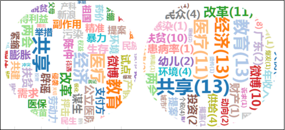 对“两会”相关报道进行内容分析,关键词“经济”、“共享”、“医疗”、“微博”、“扶贫”字体最大,颜色最深,是该舆情的核心与重点。在词频图中“共享经济”出现了13次,出现频率最高,预测有可能成为2017年两会的重点话题。