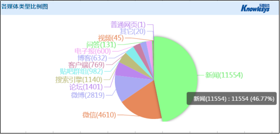 “两会”舆情的采集构成媒体类型图中,采集占比最高的是新闻,数据量11,554条,占比46.77%,排在第二位是是微信,数据4,610条,占比17.36%,排在第三位的是微博,数据量2,819条,占比1,1.24%。除此之外,论坛、搜索引擎、贴吧群组、客户端、博客、电子报等,也是构成舆情采集类型的重要媒体。