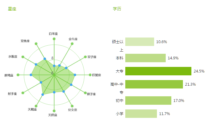 乐天集团签署萨德易地协议”的舆情受众,男性占比70%,女性占比30%35岁以上人群占比最大,达27.5%,除此之外2530岁年龄段的人数占比排在第二,3135岁人群排在第三,总体而言该舆情的受众年龄阶层偏向成熟化。参与舆情的受众中,双鱼座、水瓶座、摩羯座、天蝎座较为积极;参与者的学历占比最多的是大专,比例达24.5%,高中、中专排在第二,占比21.3%,在舆情受众中,学历中下层对于舆情的关注度更大。