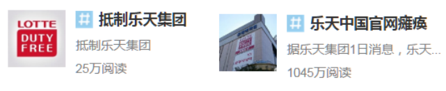 今日,新浪微博发起话题#抵制乐天集团##乐天中国官网瘫痪#,话题阅读量在短短的两天时间内分别达到25万和1045万,包括官网在内的“@央视新闻”“@人民日报”、“@光明日报”、“@中国日报”等各方媒体发声,表明爱国情怀,坚决抵制乐天集团。笔者以以下五件具体的热点事件浅要总结中国民众的主流舆论走势。