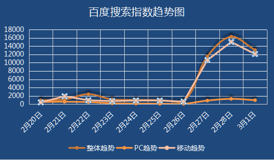 关于“乐天集团”在百度上的搜索走势图,2017220日至226日前,“整体趋势”、“PC趋势”、“移动趋势”三个指数的发展都是基本平稳,仅在221日出现微小幅度的波动,226日后“整体趋势指数”和“移动趋势指数”急速上涨,在228日达到搜索指数的顶峰值,228日乐天集团与韩军就部署“萨德”签署易地协议,乐天集团舆情搜索指数迎来高潮,相关舆论数据指数均值在16,000条以上。