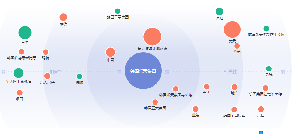 在关键词需求图谱中,韩国乐天集团相关性最强的关键词是“乐天被爆让地萨德”、“韩国乐天集团与萨德”、相关性强度大,且任然处于上升趋势,除此之外,韩国乐天集团的相关性资料“韩国五大集团”、“乐天玛特”、“业务”、“地产”等关键词,也在相关性较强的辐射范围圈。整体而言,目前舆论的聚焦点还是在于乐天集团与萨德易地上。