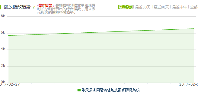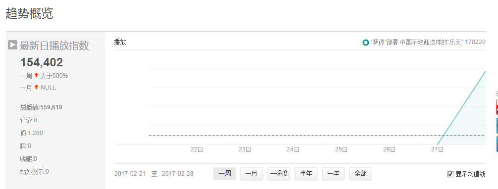 从爱奇艺指数上分析“乐天集团同意转让地皮部署萨德系统”的相关性视频,在227日出现,日均播放次数在6K次以上,228日数据量继续激增;中国网络视频指数分析视频《“萨德”部署 中国不欢迎这样的”乐天”》最新日播放指数中,该视频总播放量达159,402次,截止201732日上午10时,播放次数已达170,228次。公众爱国意识的增长使得乐天部署萨德事件的舆情极为关注。