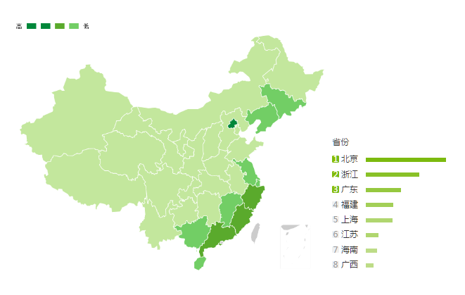 “乐天集团签署萨德易地协议”视频的播放中,移动端占比68%PC端占比32%;在地域舆情的分布中,热度最高的是北京市,地域舆情呈深绿色高亮显示。除此之外,浙江省、广东省省、福建省、上海市、江苏省、海南省等沿海地区的地域舆情也持续走高,相对而言,沿海地带对于热点的关注度普遍高于内部。