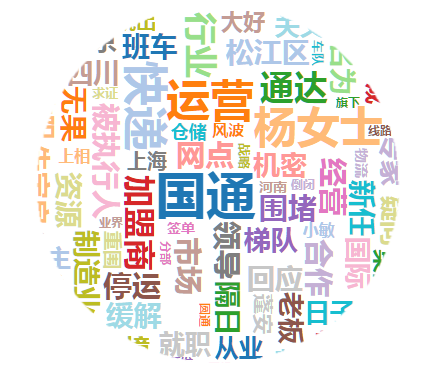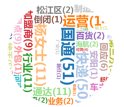 对“国通快递停运”相关报道进行内容分析,关键词“国通”、“运营”、“杨女士”、“行业”、“通达”字体最大,颜色最深,是该舆情的核心与重点。在词频图中“国通”出现了51次,出现频率最高,是全文的中心词。