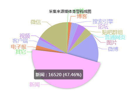 “国通快递欠费停运”舆情的采集构成媒体类型图中,采集占比最高的是新闻,数据量16,520条,占比47.46%,排在第二位是是微信,数据5,585条,占比16.04%,排在第三位的是微博,数据量5,248条,占比15.08%。除此之外,论坛、搜索引擎、贴吧群组、客户端、博客、电子报等,也是构成舆情采集类型的重要媒体。