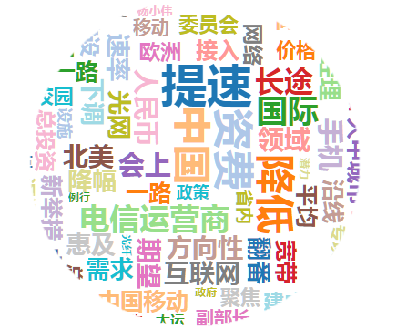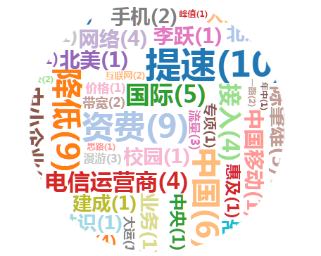 对“三大电信提速降费”相关报道进行内容分析,关键词“提速”、“资费”、“降低”、“中国”字体最大,颜色最深,是该舆情的核心与重点。在词频图中“提速”出现了10次,出现频率最高,是全文的中心词。
