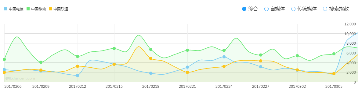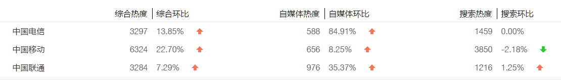 在“三大运营商提速降费”的新闻指数中,三者的综合热度都呈上升趋势,其中综合热度提升最快的是中国移动,环比上升22.7%;自媒体热度三者同样也是上升趋势,上升幅度最大的是中国电信,环比上升84.91%;搜索热度中,只有中国联通数据呈现上升趋势,中国移动搜索环比下降2.18%,中国电信没有变化。在综合趋势图中,数据波动趋势相似,三大运营商在2月18日和3月5日到达综合指数顶峰。三者数据中,中国移动舆情热度大于其他两大电信运营商。