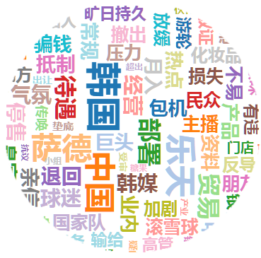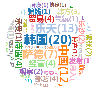 对参考消息网发表的《乐天零售面临崩溃 中方“反制”令韩难招架》进行内容分析,得到词云图和词频图,在两幅图中,关键词“韩国”出现在云图中心而且字体最大,颜色最深,出现次数也最多,达20次,是该舆情的聚焦点。关键词“乐天”、“中国”出现的次数分别排在第二和第三,这三个关键词构成了舆情的三大利益方,也是舆情的聚焦点。