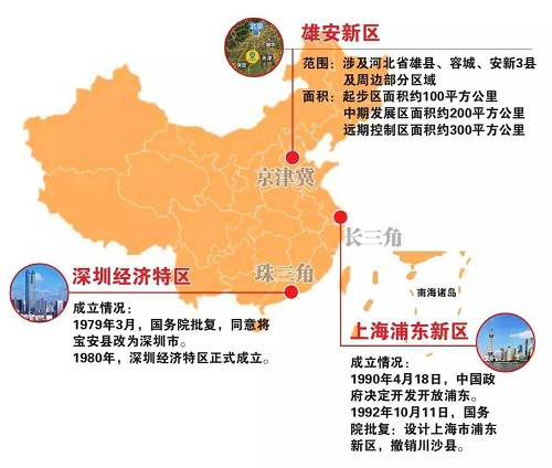 2017年4月1日 ,中共中央、国务院决定在河北省雄县、容城、安新等3个小县及周边部分区域设立的国家级新区。这是以习近平同志为核心的党中央作出的一项重大的历史性战略选择,是继深圳经济特区和上海浦东新区之后又一具有全国意义的新区,是千年大计、国家大事。