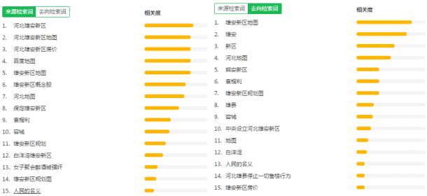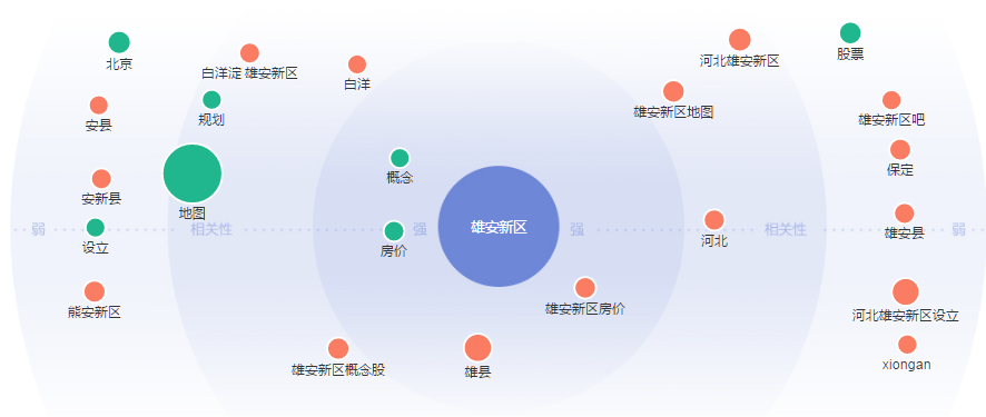 从“雄安新区”的舆情关键词图谱分析,相关舆情关键词中热度强的有“雄安新区房价”、“雄县”、“概念”等。热度较强的有“雄安新区地图”、“河北”、“雄安新区概念股”等。从关键词图谱中看,“雄安新区”相关性最密切的舆论集中在房价和概念股两个方面。