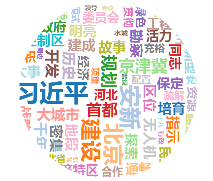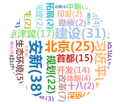 对百度百科收入的“雄安新区”概念进行内容分析,关键词“安新”、“建设”、“北京”、“规划”等字体最大,颜色最深,是该舆情的重点。在词频图中“安新”出现了38次,出现频率最高,是全文的中心词。