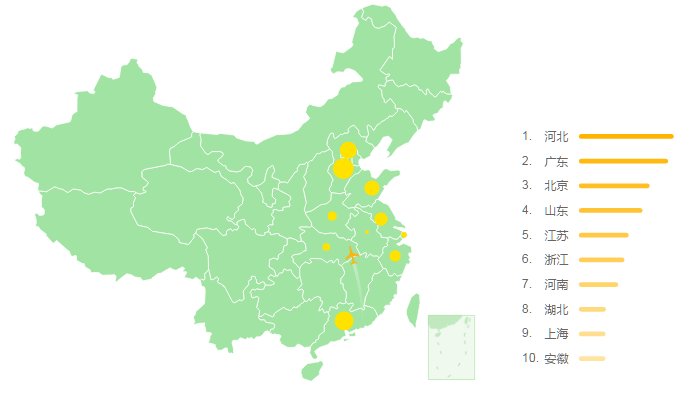 在“雄安新区”舆情的分布中,舆情热度最高的省份是:河北省、其次是广东省、北京市。由于舆情始发地为河北省,所以当地地域舆情热度最高,继而雄安新区的设立多有提及