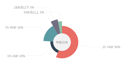 “雄安新区”的舆情受众,年龄的分布中数据主要集中在25—34岁,占比56%。其次是19—24岁,占比20%,35-49岁占比16%,中青年成为该舆情的主要受众;从性别方面分析,男性占比72%,女性占比28%,男性对于该舆情的关注度大于女性。