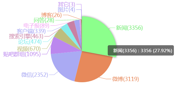“美联航”舆情采集媒体构成类型比例中,数据最多的是新闻,3356条占比27.92%,排在第二的是微博,数据3119条占比25.95%,排在第三位的是微信,数据2352条,占比19.57%,排在第四位的是贴吧群组,数据1095条占比9.11%。总的来讲,作为主流媒体的新闻,是此次“美联航”舆情的传播的主力军,作为网络媒体的微博、微信和贴吧群组,在舆情的传播中所产生的传播效应也是不容忽视的。