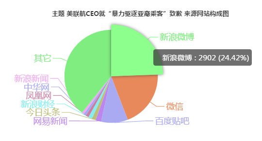 “美联航CEO就暴力驱逐亚裔乘客致歉”来源网站构成图中,数据最多的是其他,其次是新浪微博,数据量2902条,占比24.42%。除此之外,微信、百度贴吧、网易新闻、今日头条、新浪财经、凤凰网、中华网、新浪新闻等收拾该舆情的重要网站来源。