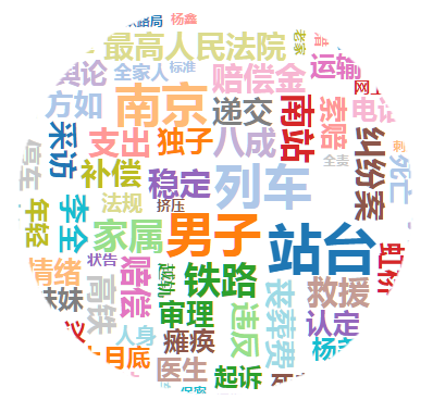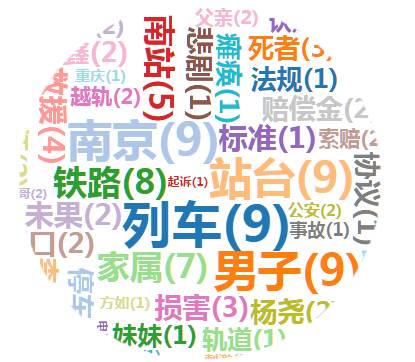 对南方都市报发表的《男子横跨轨道被动车夹死,家属索赔80万:讨个公道,不是全责就行》报道进行内容分析,关键词“南京”、“男子”、“列车”、“站台”字体最大,颜色最深,是该舆情的核心与重点。在词频图中“这几个关键词都出现了9次,是全文的中心词。