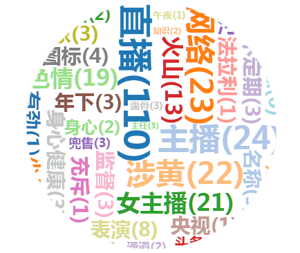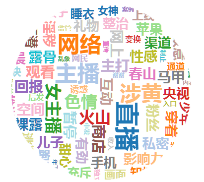 对央视网新闻发表的《《今日头条》等客户端推送涉黄直播 躲避监管》报道进行内容分析,关键词“直播”、“主播”、“网络”、“涉黄”字体最大,颜色最深,是该舆情的核心与重点。在词频图中“直播”这个关键词出现了110次,是全文的中心词,也是舆情关注焦点所在。