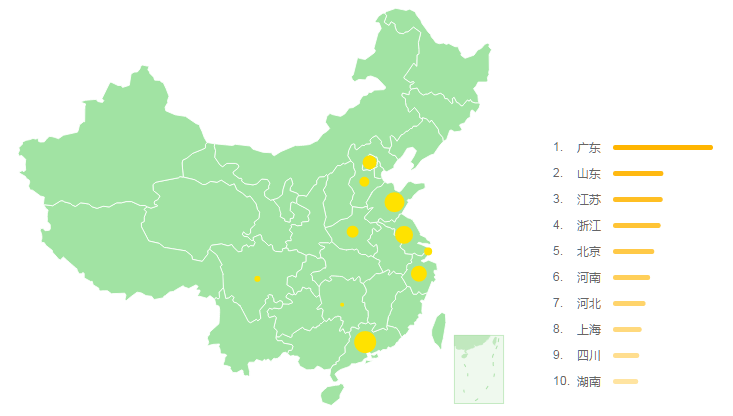 在“今日头条推送涉黄直播”舆情的分布中,舆情热度最高的省份是:广东省、其次是山东省、江苏省排在第三位。从整体来看,沿海省份舆情热度相对较内地高,广东省舆情热度尤为高涨。