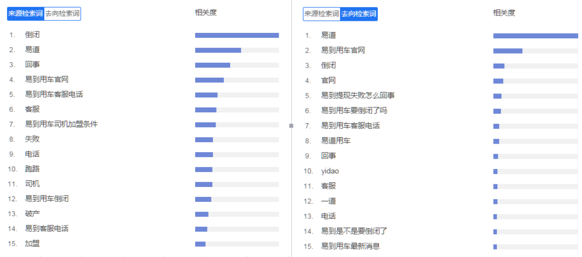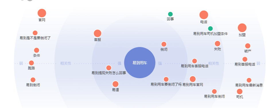 从“易到用车”的舆情关键词图谱分析,相关舆情关键词中热度强的有“易到提现失败怎么回事”、“易到用车要倒闭了吗”、“倒闭”等。热度较强的有“易到用车客服电话”、“易到用车官网”、“失败”等。从关键词图谱中看,“易到用车”相关性最强的有两个:一是提现失败的问题,二是公众怀疑易到用车倒闭。