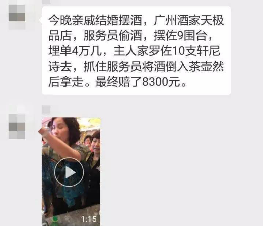 我们广州酒家这么多年一直强调诚信经营,对酒水有严格的管理,要求必须在客人看得到的地方倒酒,倒完后剩下的空瓶一定要交回给顾客数。当时管理人员也不知道,发现后急于处理事情,怕把事情报上来受到处罚,所以他们自己几个员工,包括偷酒的员工就给钱去赔了顾客,赔了8300块。