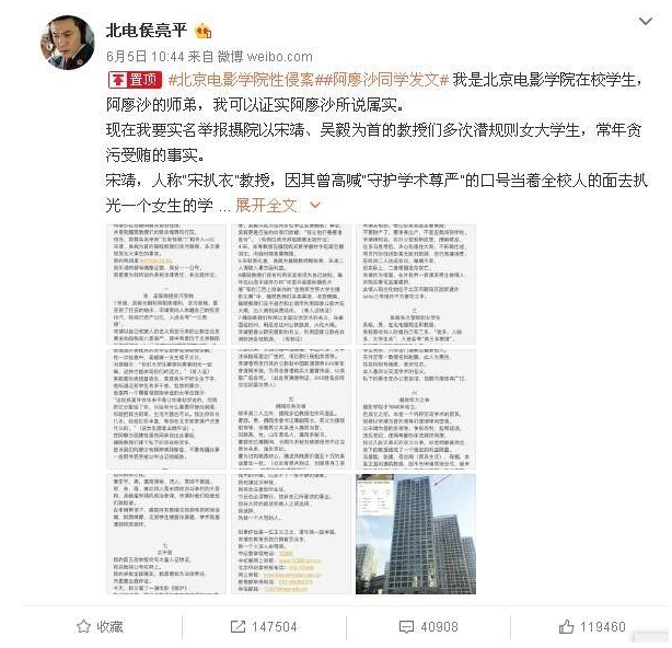 北电学生实名举报,北电性侵事件曾引发不少关注,近日,一名自称是北电学生的网友在微博上开设为@北电侯亮平的账号,实名举报北电摄影学院以宋靖、吴毅为首的教授们多次潜规则女大学生,常年贪污受贿的事实。
