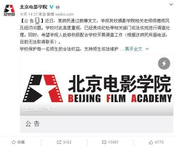 北京电影学院校方发布官方回应,内容如下:学校保护每一名师生的合法权益,支持师生依法维护个人合法权益不受侵犯。同时,也要求每一名师生遵守国家法律法规,对自己的所有言行负责。