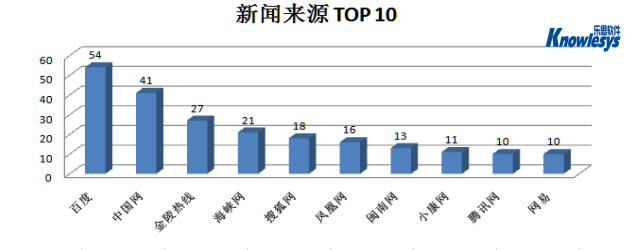 在“北电学生实名举报事件”的新闻来源排行TOP10中,排在第一位的是百度,共计54篇报道;排在第二的是中国网,共计41篇报道;排在第三的是金陵热线,共计27篇报道。此外,海峡网、搜狐网、凤凰易、闽南网、小康网、腾讯网、网易等网站都是该舆情传播的重要新闻源。