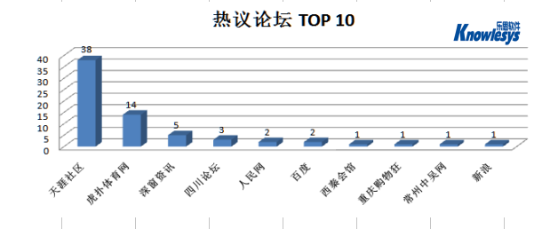在“北电学生实名举报事件”的论坛来源排行TOP10中,排在第一位的是天涯社区,共计38条相关数据;排在第二的是虎扑体育网,共计14条数据;排在第三的是深窗资讯,共计5条数据。此外,四川论坛、人民网、百度、西秦会馆、重庆购物狂、常州中吴网、新浪等论坛都是该舆情传播的重要网络媒体。