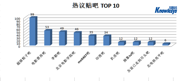 通过乐思软件舆情监测系统得到的数据,在“北电学生实名举报事件”的贴吧来源排行TOP10中,排在第一位的是超级粽子吧,共计99条相关数据;排在第二的是电影票房吧,共计53条数据;排在第三的是李毅吧,共计49条数据。此外,北京电影学院吧、me0407吧、印度吧、扒皮吧、等贴吧对该事件的提及率也比较高。