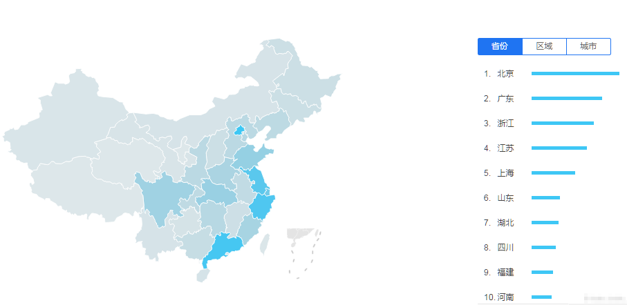 在“北电学生实名举报事件”舆情的分布中,舆情热度最高的省份是北京市,地域舆情呈现蓝色高亮显示,除此之外,广东省、浙江省、江苏省等沿海城市的舆情热度也持续走高。由于北京市是此次舆情的事发地,所以该区域舆情热度最高。