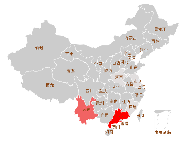 在“奥宸地产”地域舆情的分布中,舆情热度最高的省份是广东省,地域舆情呈现红色高亮显示。此外,云南省的舆情热度也持续走高,呈现为红色。由于广东深圳市是奥宸地产的总部所在地,所以地域舆情最热,其次云南省作为奥宸地产的发源地,地域舆情热度也较高。