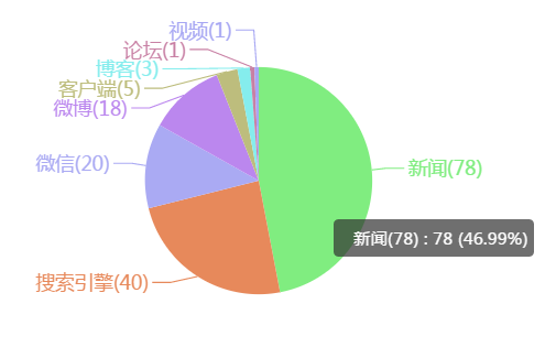 在“奥宸地产”舆情媒体构成类型中,排在第一的是新闻,数据78条,占比46.99%,其次是搜索引擎,数据40条,占比23.67%,排在第三的是微博,占比19.05%。新闻成为此次舆情的主要构成媒体,搜索引擎次之。
