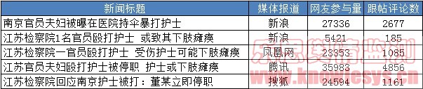 江苏检察院官员殴打护士致瘫痪经网络曝光后,迅速在网上传播,在微博、新闻、论坛等平台吸引大量网友的围观和参与。依据乐思网络监测系统采集的数据统计可知,截至26日17时30分,该话题新闻曝光量达247篇,仅新浪、腾讯、凤凰、搜狐四家媒体的报道就吸引了超过10万人参与议论,跟帖接近1万条。而新浪微博用户“@南京市口腔医院二门诊”的控诉贴文被转2061次,跟帖1144条。从网友的跟帖来看,有超过9成的评论是指责暴力袭医和呼吁严惩施暴者的。