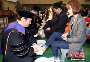 当地时间2014年2月25日,韩国釜山,一所大学在入学典礼上举行“洗足仪式”,校长和教授们亲自为学生洗脚,以表达对学生的关爱。