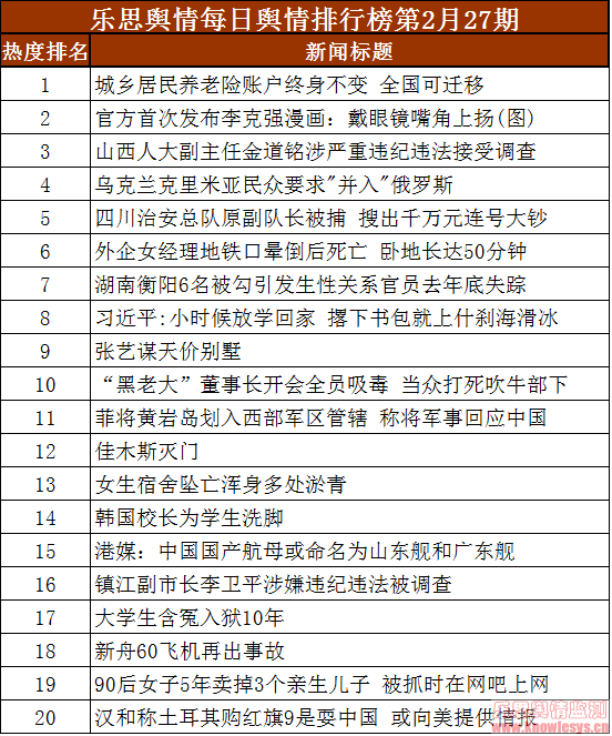 2014年2月27日乐思每日舆情热点排行榜导读:城乡居民养老险账户终身不变 全国可迁移;官方首次发布李克强漫画:戴眼镜嘴角上扬;山西人大副主任金道铭涉严重违纪违法接受调查;乌克兰克里米亚民众要求”并入”俄罗斯;四川治安总队原副队长被捕 搜出千万元连号大钞……