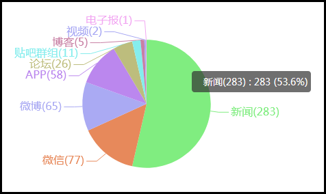 在舆情媒体构成类型中,排在第一的是新闻,数据283条,占比53.6%,其次是微信,数据77条,占比14.58%,排在第三的是微博,数据65条占比12.31%。主流媒体成为此事件主要传播和构成媒体,网络媒体是网友们重要的讨论平台。