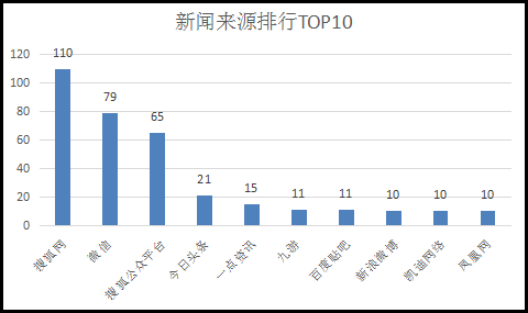 在新闻网站报道排行榜前TOP10中,排在第一位的搜狐网,数据为110条,是这次事件主要的传播平台,排在第二第三的是微信和搜狐公众平台,数据分别为79条和65条。除此之外,今日头条、一点资讯、凤凰网、百度贴吧、新浪微博等都是此次报道的重要的新闻来源网站。