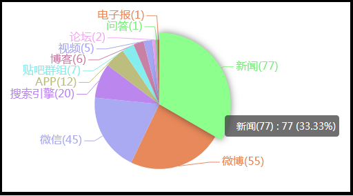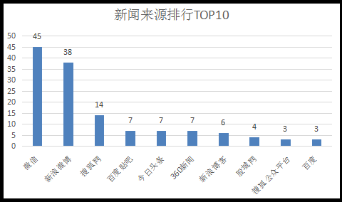 在新闻网站报道排行榜前TOP10中,排在第一位的微信,数据为45条,是这次事件主要的网友热议平台,排在第二第三的是新浪微博和搜狐网,数据分别为38条和14条。除此之外,百度贴吧、今日头条、360新闻、新浪博客、搜狐公众平台、百度等都是此次报道的重要的新闻来源网站。