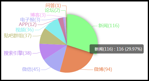 在舆情媒体构成类型中,排在第一的是新闻,数据116条,占比29.97%,其次是微博,数据94条,占比24.29%,排在第三的是微信,数据45条占比11.63%。主流媒体成为此事件的主要传播和构成媒体,网络媒体则是网友的重要讨论平台。