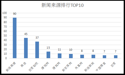 在新闻网站报道排行榜前TOP10中,排在第一位的新浪微博,数据为90条,是这次事件主要的网友热议平台,排在第二第三的是微信和百度贴吧,数据分别为45条和37条。除此之外,播视网、搜狐网、新京报网、凤凰网、百度等都是此次报道的重要的新闻来源网站。