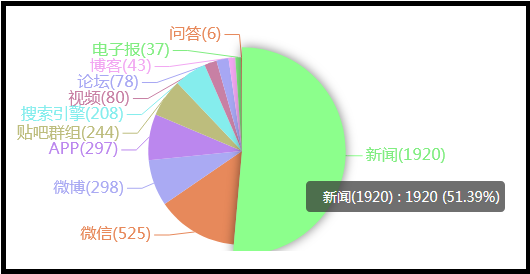 在舆情媒体构成类型中,排在第一的是新闻,数据1920条,占比51.39%,其次是微信,数据525条,占比14.05%,排在第三的是微博,数据298条占比7.98%。主流媒体成为此事件的主要传播和构成媒体,网络媒体则是网友的重要讨论平台。