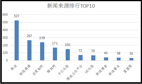 在新闻网站报道排行榜前TOP10中,排在第一位的微信,数据为527条,是这次事件主要的网友热议平台,排在第二第三的是新浪微博和百度贴吧,数据分别为267条和239条。除此之外,搜狐网、今日头条、搜狐公众平台、UC头条、新浪博客等都是此次报道的重要的新闻来源网站。