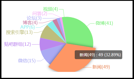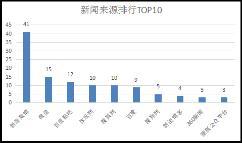 在新闻网站报道排行榜前TOP10中,排在第一位的新浪微博,数据为41条,是这次事件主要的网友热议平台,排在第二第三的是微信和百度贴吧,数据分别为15条和12条。除此之外,搜狐网、百度、搜狐公众平台、搜狗网、新浪博客等都是此次报道的重要的新闻来源网站。