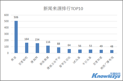 在新闻网站报道排行榜前TOP10中,排在第一位的是微信,数据为506条,是这次事件主要的网友热议平台,排在第二第三的是百度贴吧和搜狐网,数据分别为164条和154条。除此之外,新浪微博、搜狐公众平台、今日头条、UC头条等都是此次报道的重要的新闻来源网站。