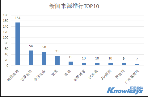 新闻网站报道排行榜前TOP10中,排在第一位的是新浪微博,数据为154条,是这次事件主要的网友热议平台,排在第二第三的是百度贴吧和今日头条,数据为54条和50条。除此之外,百度、微信、新浪博客、UC头条、360新闻、搜狐网等都是此次报道的重要的新闻来源网站。