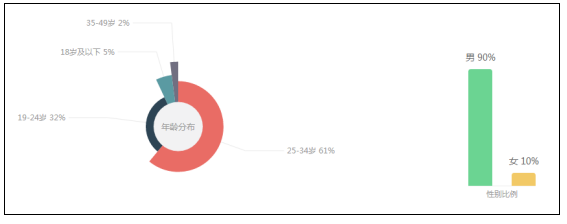对于事件舆情的关注,男生比例比女生高,男生比例达90%,在年龄层来说,25-34岁人群占比最大,达到61%,占总人群的6成多,排在第二的是19-24岁,占比32%,占比最小的是35-49岁的人群,占比仅2%。从人群属性来看,青壮年对于事件舆情更为关注。